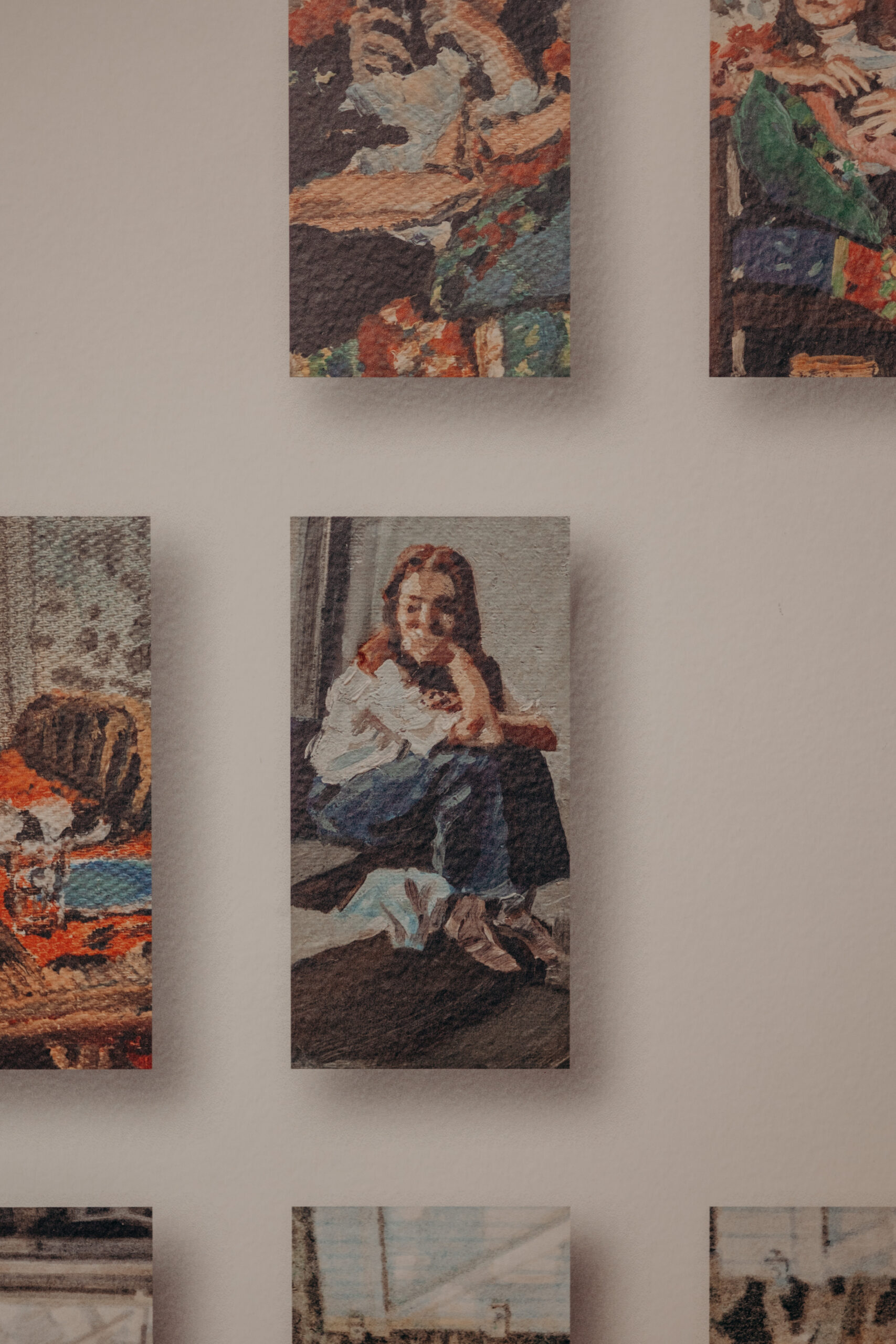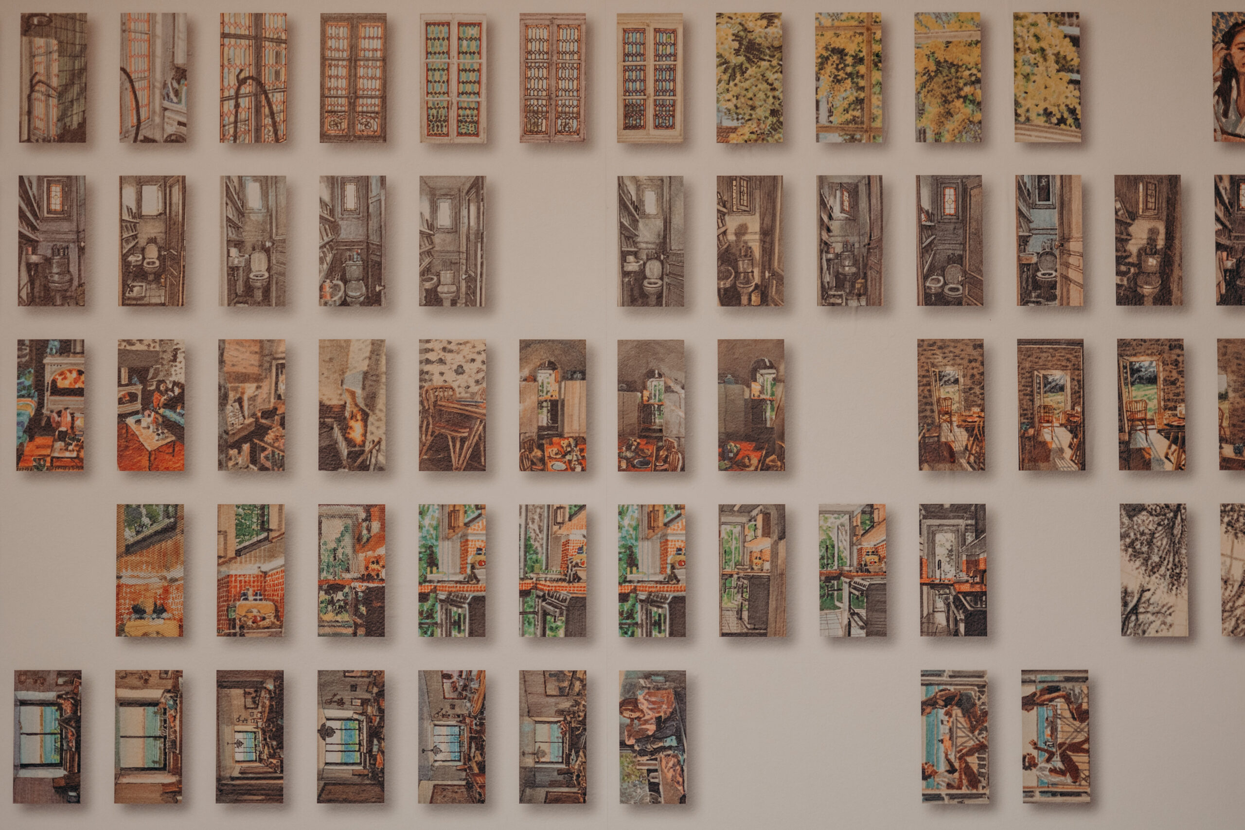 Anne Sedel peint depuis 2016 les « souvenirs de sa vie sur terre ». Ses formats ont la taille d’un téléphone portable tel que «Ariane aux rochers» et «Katia à la Petite Corbière». Elle a peint plus de mille lieux qu’elle aime : ses enfants, son atelier, les sanitaires et beaucoup de fenêtres. Ses miniatures de la vie quotidienne gardent précieusement l’essentiel à ses yeux. Elle les a rassemblées, ponctuées de respiration, pour créer un papier peint réunissant ses « portraits d’intérieurs ».