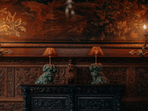 Deux chiens en céramique, inspirés des paires de chiens en porcelaine de type Staffordshire, très populaires au XIXe siècle en Angleterre, s’invitent dans la salle à manger au style néo-renaissance flamand où les adultes de la famille Terlinden se retrouvaient lors des repas principaux. Antoine a découvert dans les lambris en chêne des petits monstres sculptés dont il a fait des moulages pour composer ses céramiques créées in situ.