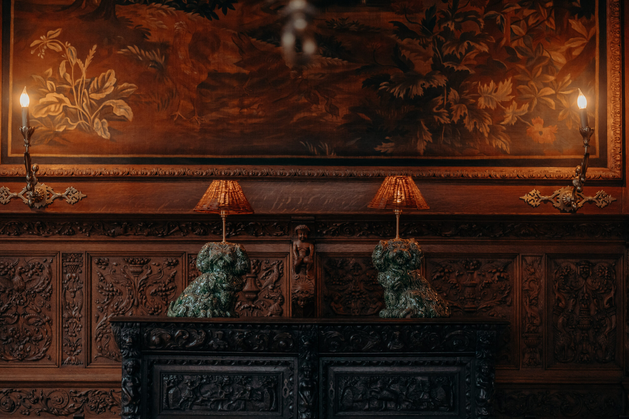 Deux chiens en céramique, inspirés des paires de chiens en porcelaine de type Staffordshire, très populaires au XIXe siècle en Angleterre, s’invitent dans la salle à manger au style néo-renaissance flamand où les adultes de la famille Terlinden se retrouvaient lors des repas principaux. Antoine a découvert dans les lambris en chêne des petits monstres sculptés dont il a fait des moulages pour composer ses céramiques créées in situ.