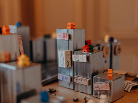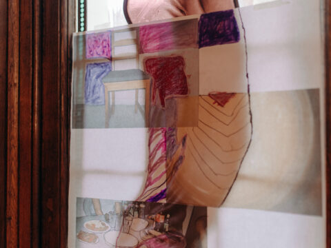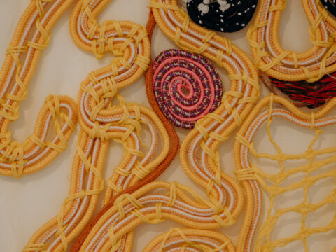 Louise investit la salle à manger en collaboration avec les élèves de l’Institut Sainte-Marie, partenaire des projets de La Maison des Arts depuis quelques années. Ensemble ils ont exploré le textile comme matière de création et de lien, réfléchissant à ce que représente cet espace de partage et de convivialité autour de la nourriture. De là est née une oeuvre textile collective, fruit du dialogue entre les élèves et l’artiste, mêlant leur gestes, leur idées et leur sensibilités