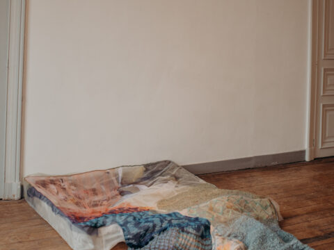 Pour le lit « funéraire cette fois » s’entremêle impressions fugaces, anecdotes récoltées et détails glanés d’intérieurs. La transparence et le moiré du papier protègent de vieilles photos et incluent des fleurs factices récupérées dans la poubelle d’un cimetière. Cette œuvre rappelle discrètement et avec douceur que si la vie se déclenche souvent dans un lit, elle s’y termine généralement aussi.